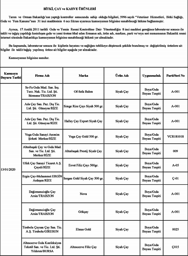 Bakanlık tarafından açıklanan ve ürünlerinde gıda boysı kullandığı tespit edilen çay firmaları şu şekilde sıralandı;