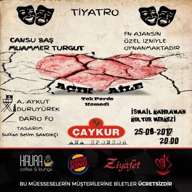 Bülent Ecevit Üniversitesi Devlet Konservatuarı Tiyatro Bölümü öğrencilerinden Aykut Duruyürek'in yönettiği, Cansu Baş ve Muammer Turgut'un oynadığı, Dario Fo'nun eseri olan 'Açık Aile' isimli tiyatro oyunu, 25 Ağustos 2017 Cuma akşamı saat 20:00'de, Rize İsmail Kahraman Kültür Merkezinde sahnelenecek.