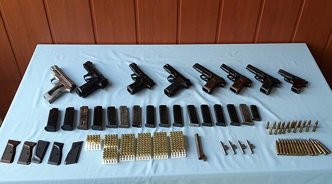 Rize’nin Ardeşen ilçesinde kaçak silah imalatı yapıldığına dair ihbarı üzerine Rize İl Jandarma Komutanlığına bağlı ekiplerinde üç ayrı adrese yaptığı operasyonlarda 7 adet 9 mm tabanca, 1 adet 9 mm yarı mamul tabanca, 197 adet 9 mm, 67 adet 7.65 mm ve 20 adet 9.65 mm tabanca mermisi ile tabanca imalatında kullanılan makine ve aletler yakalandı.