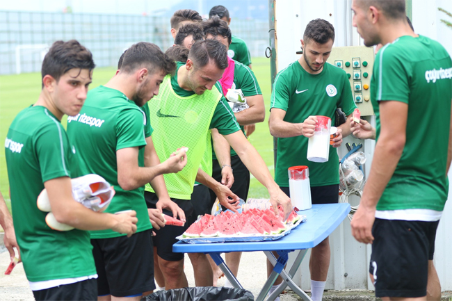 Rize’de 34 derece sıcaklık ve yüzde 90 oranında nem altında çalışan futbolcular idmanlarda zorlarken, bu noktada Atmacaların imdadına karpuz ve soğuk ayran yetişiyor.