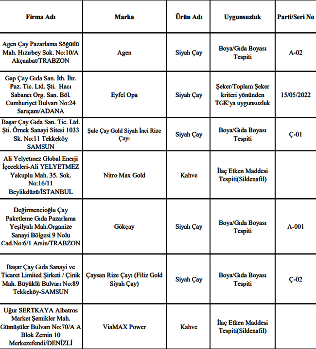 Daha önce 6'sı Rize'den olmak üzere 11 çay firmasının satışa sunduğu kuru çaylardan gıda boyası tespit edildiğini açıklayan Tarım ve Orman Bakanlığı, bu kez 2'si Trabzon merkezli olmak üzere 7 çay firmasında daha gıda boyası tespit etti.