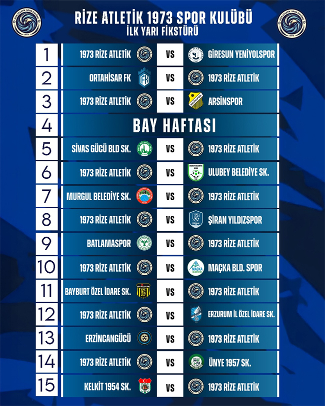 Rize Özel İdarespor'un kuruluş yılına ithafen bu sezon ligde Rize Atletik 1973 Spor Kulübü ismiyle mücadele edecek olan Rize temsilcisi ilk maçını 10 Ekim Cuma günü saat 14:00'da lige yeni yükselen Giresun temsilcilesi Yeniyol Spor Kulübü ile oynayacak. Ligde 4. Haftayı BAY geçecek olan Rize Atletik ekibi ilk deplasman mücadelesini ise Trabzon'da 18 Ekim Cumartesi günü 14:30'da Ortahisar Futbol Spor Kulübü'ne karşı verecek.