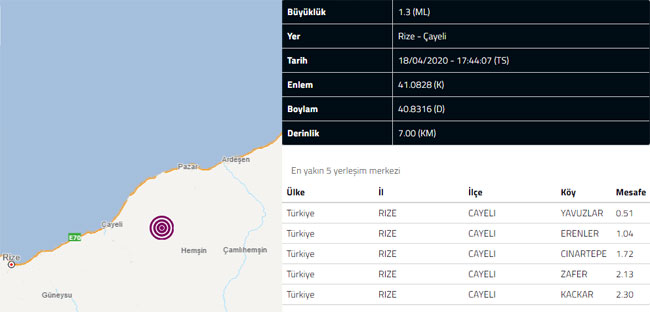AFAD tarafından yayınlanan deprem verilerine göre Rize'nin Çayeli ilçesi hafif şiddetle sarsıldı.