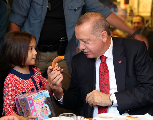 Esnaf ziyaretinde Cumhurbaşkanı Erdoğan bir süre caddede bulunan bir kafede vatandaşlarla çay içti. Erdoğan, burada bir çocukla ilgilenerek oyuncak hediye etti.