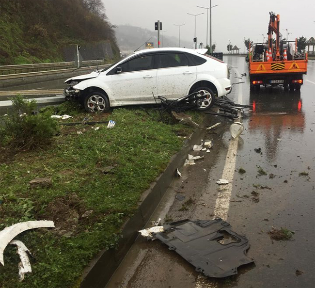 Refüjlerle birlikte aydınlatma direğine de çarpan otomobil, aydınlatma direğini de devirdi. Hava yastıklarının açılması sayesinde otomobil sürücüsü ve yanındaki kişi kazayı yara almadan atlattı.