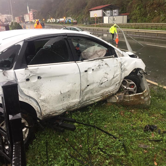Rize'nin Derepazarı ilçesinde meydana gelen kazada, kontrolünü kaybeden otomobil yol kenarında refüjlere çarparak aydınlatma direğini devirdi.