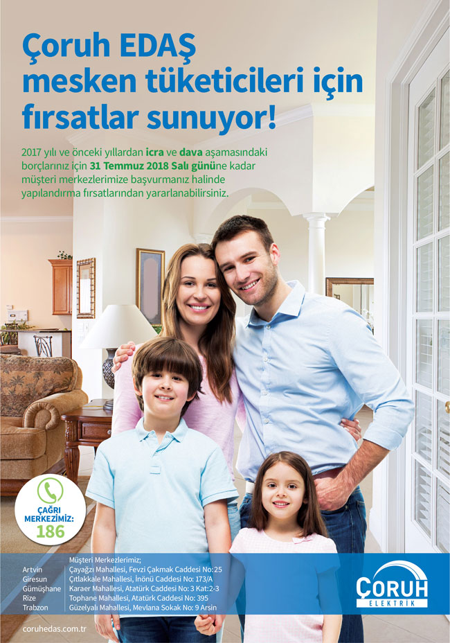 Elektrik dağıtım sektöründe tüketici memnuniyeti esası ile hizmet veren Çoruh EDAŞ, 2017 yılı ve önceki yıllarda icra ve dava aşamasındaki abonelerin borçları için 31 Temmuz 2018 Salı Günü’ne kadar Çoruh EDAŞ müşteri merkezlerine, il ve ilçe şefliklerine başvurarak yapılandırma fırsatlarından yararlanabilecek.