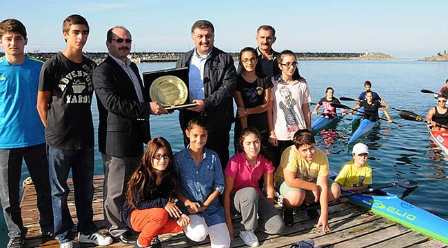 Gündoğdu Su Sporları Kulübü Başkanı Bilgin Kopuz teşekkür konuşmasının hemen ardından tüm sporcular adına Milletvekili Hasan Karal'a bir plaket takdim etti.