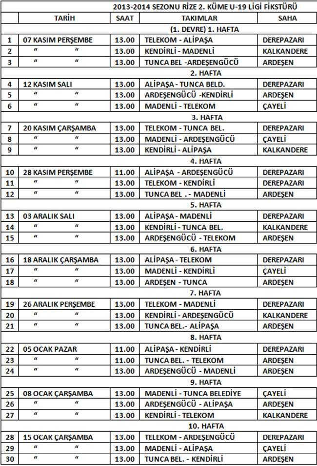 2013-2014 Futbol sezonu Rize 2. Küme U-19 Ligi fikstürü belirlendi.