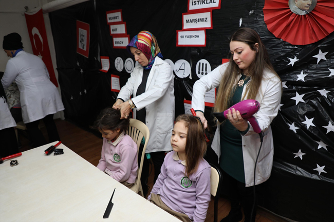 İlçe Milli Eğitim Müdürlüğü koordinesinde aynadan fön makinesine kadar tüm araç ve gereçleri okullara götüren kadınlar, ailelerin onayıyla isteyen her öğrencinin saç kesimi ve bakımını ücretsiz yapıyor.