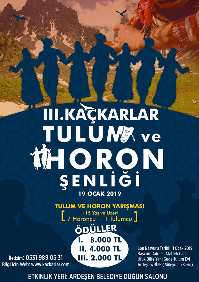 Birinciye 8 bin lira para ödülünün verileceği horon yarışmasının da yer aldığı "3. Kaçkarlar Tulum ve Horon Şenliği" 19 Ocak Cumartesi günü akşam saat 18.00'de Ardeşen Belediye Salonunda gerçekleştirilecek.