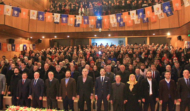 Programın açılış konuşmasını yapan Merkez İlçe Başkanı Sadettin Türüt katılım sağlayan herkese teşekkür ederek, “Bizler Anadolu ikliminin,bu garip mevsimi ahir zamanın bu zaman has meyveleriyiz. Bizler biliyoruz ki, yüce sahibinden habersiz ve izinsiz dalından bir yaprak bile yere düşemez yine bizler biliyoruz ki, tesadüf denilen şey bir yalandır. Ancak ve ancak, yüce Yaradan’ın buyruğu ile kulunun temennisinin örtüşmesi anlamına gelecek olan tevafuk bizlere gerçeği ifade edebilir. Evet, kesinlikle ve kesinlikle o kişiler bu kişiler değil, bizzat bizler bu görev için Yüce Yaradan bizleri memur eylediği için buradayız. Eğer önümüzdeki yıllarda sağ isek, var isek yaptıklarımızın nerelere sebep olabileceğini sizler bile o gün orada olduğunuzda gördüğümüzde inşallah sevinçle hayretler içerisinde kalacağız. Bu sebepledir ki kim tarafından seçildiğimiz ve nasıl bir görev için seçildiğimizi bilerek, dava gemimizin küreklerine asılmamız gerekir. Çünkü bu geminin yükü adalettir, merhamettir, berekettir. Çünkü bu geminin silahları asalettir, cesarettir, ferasettir. Çünkü bu geminin yardımına yetişmeye çalıştıkları yetimlerdir, öksüzlerdir gariplerdir. Hakları elinden hoyratça çekilip anlaşmış olan, Anadolu insanı İslam Ümmeti ve tüm dünyanın diğer mazlumlarıdır. Ama bu geminin, yine tesadüfen dümene oturmamış olan, bu zaman özel seçilmiş dümene memur edilmiş kaptanı, reisi vardır. Tüm mazlumların dualarıyla gemisini, fırtınalardan sıyrılıp, Hakk menziline yüzdüren ve inşallah yüzdürmeye devam edecek olan, Recep Tayyip Erdoğan’dır. Bu sebepledir ki bizlere düşen, günlük hayatta zalim nefsimizin bitmek bilmeyen istek ve arzularına uymamaktır. Bu büyük hedeflerin yanında, bazı aksaklıkları mesele etme alışkanlıklarımızı elimizin tersiyle itmektir. Bizleri böyle bir zamanda, böyle bir dava ve böyle bir lidere gönüldaşlığa seçtiği için Yüce Allah’a şükretmektir. Bir kere daha Allah rızası için niyet tazeleyerek, bu bahtiyar, bu nasipli, bu şanlı gemide, nice kutlu menzillere doğru ahiret hediyelerine niyetlenerek kürek çekmektir. Ve sefer bizim zafer ancak Allah’ındır demektir” dedi.