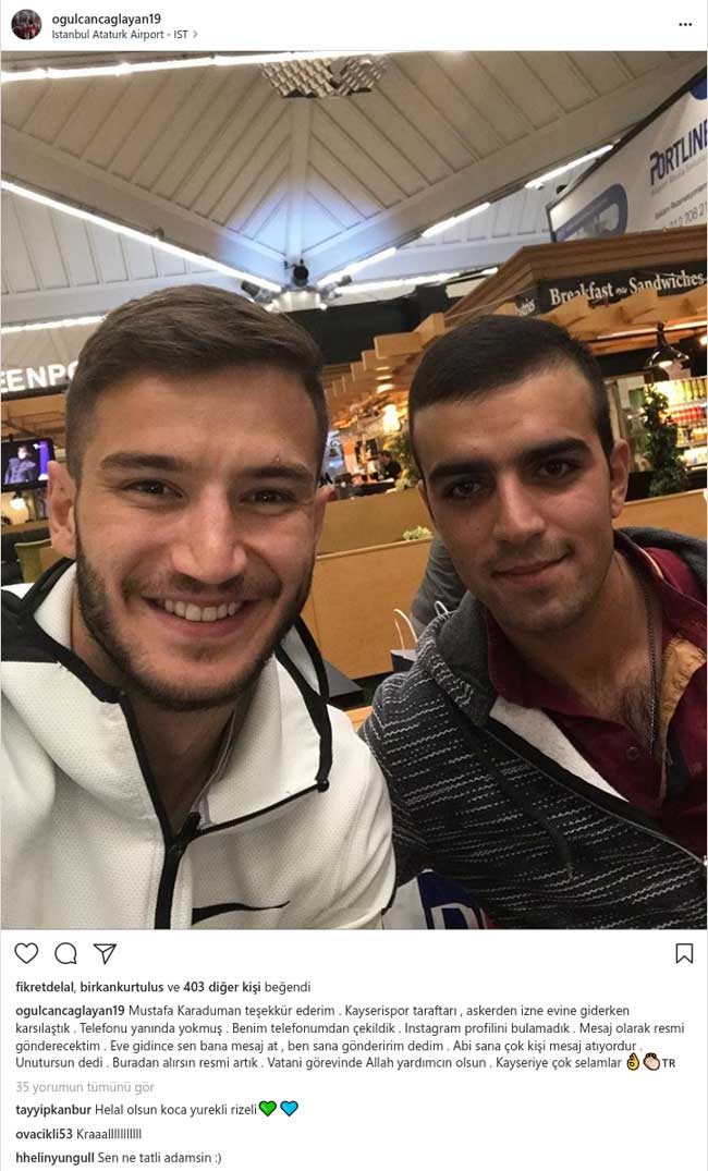Maçın ardından Rize'ye dönüş yolunda Atatürk Havalimanında karşılaştığı ve vatani görevini yapmakta olan Kayserisporlu taraftar Mustafa Karaduman ile kendi cep telefonuyla çektirdikleri fotoğrafı instagram hesabı üzerinden ulaştıran Oğulcan Çağlayan, mesajında şunları yazdı; "Mustafa Karaduman teşekkür ederim. Kayserispor taraftarı, askerden izne evine giderken karsılaştık. Telefonu yanında yokmuş. Benim telefonumdan çekildik. Instagram profilini bulamadık. Mesaj olarak resmi gönderecektim. Eve gidince sen bana mesaj at, ben sana gönderirim dedim. Abi sana çok kişi mesaj atıyordur. Unutursun dedi. Buradan alırsın resmi artık. Vatani görevinde Allah yardımcın olsun. Kayseriye çok selamlar"