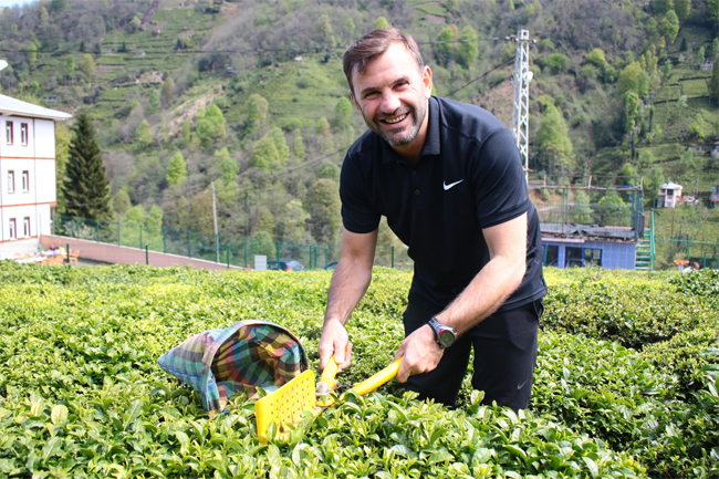 Öğrencilerle fotoğraf çektiren Teknik Direktör Okan Buruk, ardından okulun yanında bulunan çay bahçesine girerek eline aldığı çay makası ile çay topladı.