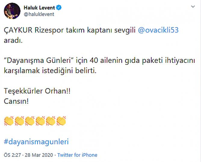Twitter hesabından, Çaykur Rizespor takım kaptanı Orhan Ovacıklı'nın kendisini aradığını ve başlattığı "Dayanışma Günleri" adlı yardım kampanyasında 40 ailenin gıda paketini karşılayacağını dile getiren Haluk Levent, Rizeli futbolcuya teşekkür etti.