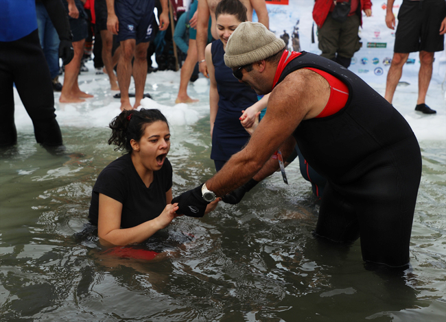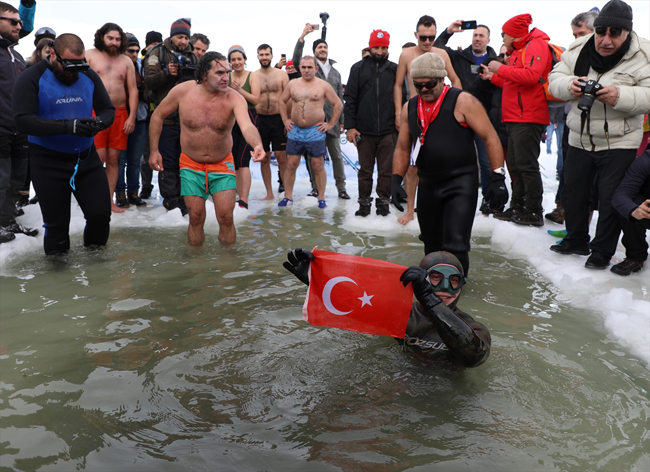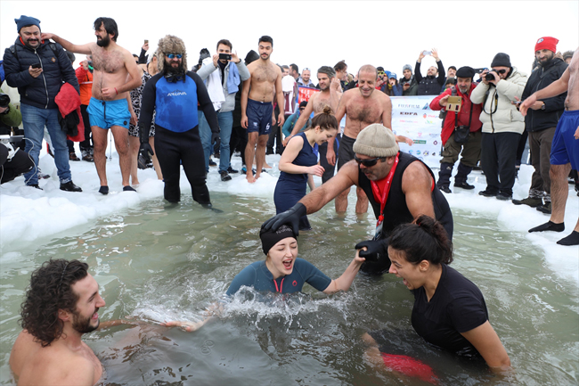Katılımcılardan 40'ı suya girmeye cesaret edebildi. Dondurucu suda yüzen katılımcılar, çay içerek ısınmaya çalıştı.
