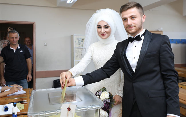 Gelin Şükriye Tarlacı ise gelinlikle sandık başına gitmenin çok farklı ve heyecanlı bir duygu olduğunu belirtti.
