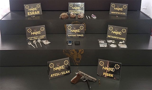 Operasyonlarda yapılan aramalarda 172,72 gram bonzi olarak bilinen sentetik cannobinoid, yaklaşık 100 gram bonzai üretilebilen 1,27 gram bonzai hammaddesi, 15,47 gram metamfetamin, 7,46 gram esrar, 5 adet uyuşturucu kullanım aparatı, 4 adet sentetik ecza hapı, 3 adet ruhsatsız tabanca ve tabancalara ait 87 adet mermi ile 1 adet hassas terazi ele geçirildi.