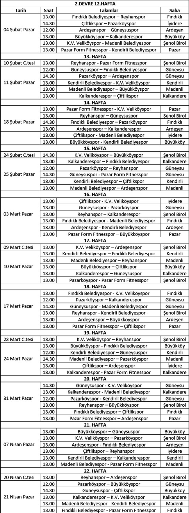 Rize Süper Amatör Liginde 2. Devre, 04 Şubat Cumartesi ve 05 Şubat Pazar günü oynanacak olan 12. Hafta maçlarıyla başlayacak.