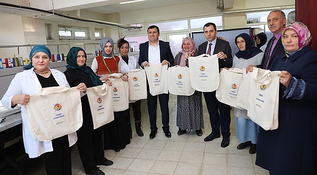Proje kapsamında İlçe Halk Eğitim Merkezi Müdürülüğünde bir araya gelen kadınlar, bezden alışveriş çantaları dikmeye başladı.