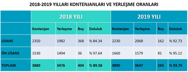RTEÜ genelinde lisans programlarının kontenjanlarına % 95.12 oranında, ön lisans programlarının kontenjanlarına da % 92.73 oranında yerleşme olurken, bu sonuçlara göre Recep Tayyip Erdoğan Üniversitesinin toplamda % 93.75 tercih edilirlik oranına yükseldi.
