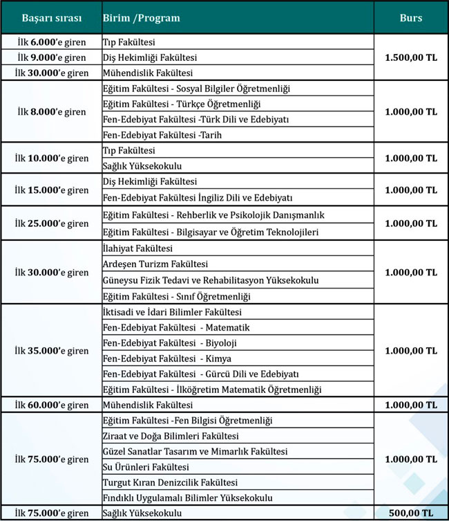 Recep Tayyip Erdoğan Üniversitesi’nden yapılan açıklamada şunlar belirtildi; “Öğrencilerin donanımlı bireyler olması için kaliteli eğitimden asla taviz vermeyen, güçlü akademik kadrosu ile göz dolduran, tüm programlarımızdaki % 99 yerleşme oranıyla tercih edilen bir üniversite haline gelen, ulusal ve uluslararası saygınlığa sahip, şehirle her yönden bütünleşmiş, yeniliklere açık, modern, her geçen gün adından daha fazla söz ettiren Recep Tayyip Erdoğan Üniversitesi, Üniversiteye giriş sınavında başarı göstererek kendi puan türüne göre belli yüzdelik dilimlerine girip Üniversiteyi tercih eden öğrenciler için başarı bursu fırsatı sunuyor.