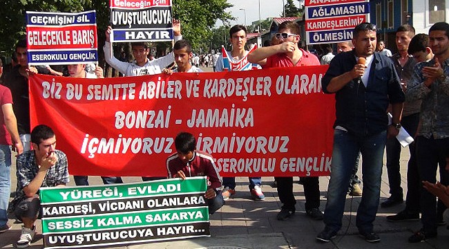 ‘Biz bu semtte ağabeyler ve kardeşler olarak bonzai ve jamaika içmiyoruz, içirmiyoruz’, ‘Yüreği, evladı, kardeşi, vicdanı olanlara; sessiz kalma Sakarya uyuşturucuya hayır', ‘Uyuşturucu gençliğin katilidir’, 'Bir neslin yok olmasına hayır’ yazılı dövizler taşıdı, ‘İçme içirme şehrine sahip çık' sloganı attı. Araç sürücüleri de kornalara basarak gençlere destek verdi.