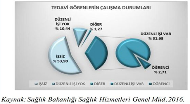 Tedavi gören hastaların %53,90’nı işsiz, %10,44’nün düzenli işinin olmadığı, % 31,68’nin düzenli işi olduğu ve %2,71’nin ise öğrenci olduğu görülmektedir.