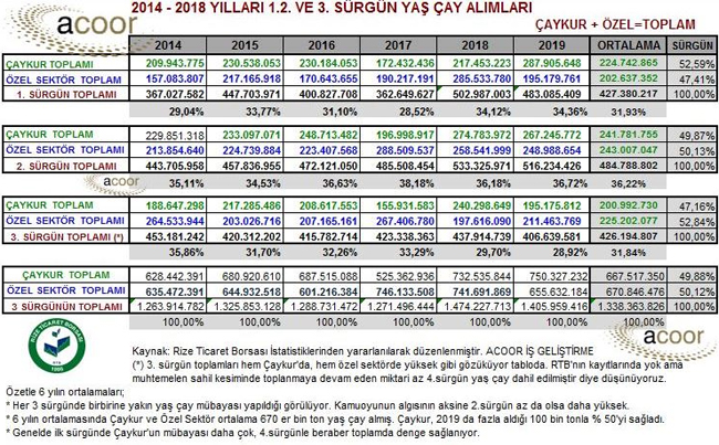 2014 – 2019 yılları arasında Çaykur ortalama her yıl Çaykur 668 bin ton, Özel sektörde 671 bin ton yaş çay alımı gerçekleştirmiş. Özel sektörde 6 yıl boyunca ortalamadan pek fazla sapma gözükmezken ÇAYKUR’da 525 bin ton ile 750 bin arasında gerçekleşmeler olmuş!