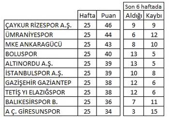 Ancak, zirvede ki 3 takım; Çaykur Rize, Ümraniye ve Ankaragücü son haftalarda bol keseden harcama yaparken arkadan gelen 5 takım Bolu, Altınordu, İstanbulspor, Antep Gazişehir ve Elazığspor tam aksine maç başına 2 puan üzeri performansla zirveye çok yaklaştılar.